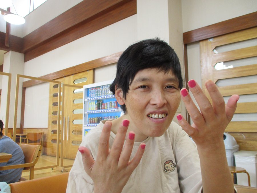 矢吹しらうめ荘2024.10.01 ~矢吹しらうめ荘9月の様子~ 厳しい暑さが過ぎ去り、すっかり爽やかな秋空が続く季節となりました。 体調を崩しやすい時期ですが、皆様穏やかに過ごされております。 矢吹しらうめ荘では、9月に矢吹町内の「いやさか」へ出掛け、事前に予約した個室で 食事会を開催したり、女子棟レクリエーションにてネイル教室を開催したり、ドライブに 出掛けたり、希望外出などを行いながら、楽しく過ごされております。 ※掲載されている写真はお客様の了承を得ております。 いやさかの前で「はいチーズ!」 ピンクのネイルを選択しました! ハロー! 一覧へ戻る