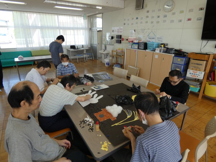 朝夕はめっきり涼しくなり過ごしやすい季節となりました。日中活動時間には、絵描きや工作、カラオケや体操などお客様が行いたい活動に取り組みながら楽しく過ごされております。カラオケでは採点をする方もおり、高得点が出ると周りの方から拍手が沸き起こり、自然と笑顔になる心温まる場面がありました。また10月に開催されるあゆり祭に展示する作品も仕上がり、先日職員が作品の搬入をしてきました。