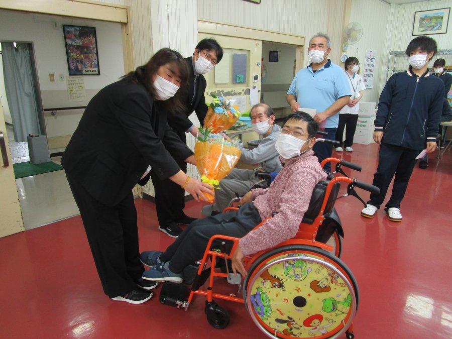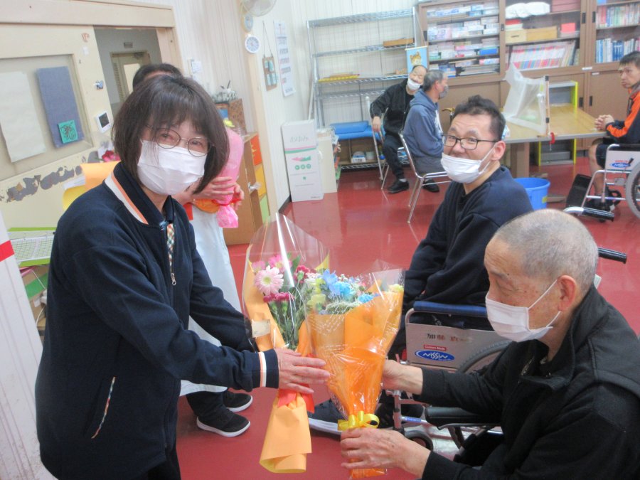 令和8年3月31日にひばり寮で離任式が行われました。今回は1名の離任者、3名の退職者がおり、最後の挨拶に涙を浮かべる職員や、お客様の様子が見られました。
